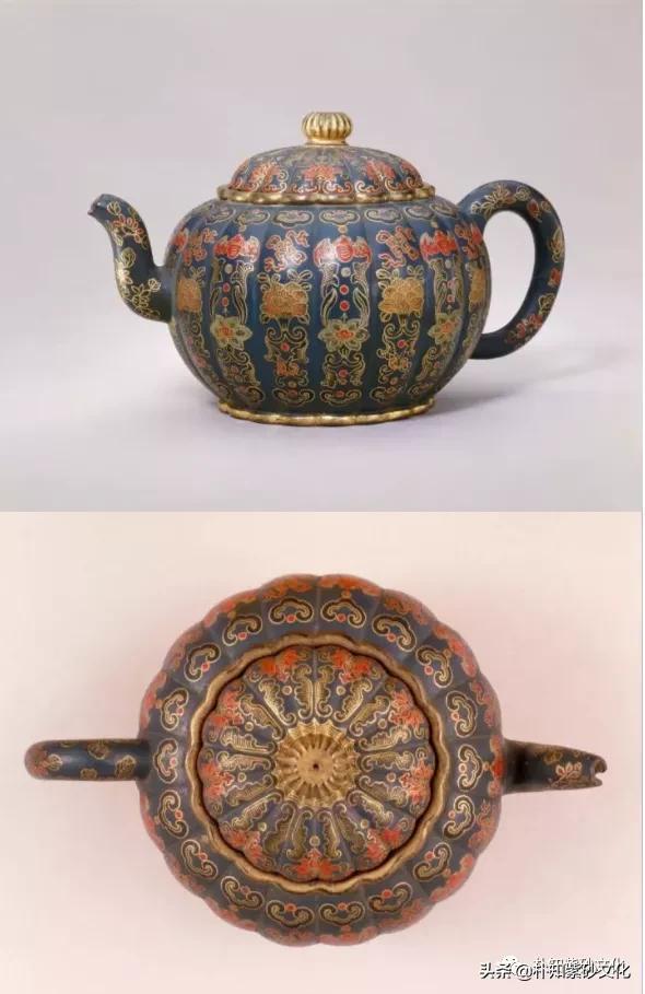 绿地描金瓜棱壶藏有一对,原存放于皇帝的寝宫养心殿内,是乾隆皇帝喜爱的御用紫砂精品。
