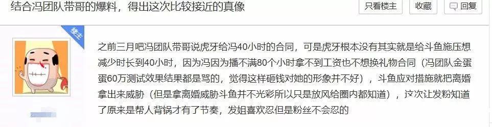 至于这件事为什么突然会被曝光呢,根据知道内幕的网友说是因为冯提莫和斗鱼之间的合约问题,斗鱼方面要求冯提莫要直播满80个小时才能拿到工资,冯提莫想要斗鱼方面减少时间,斗鱼方面则拿出冯提莫离过婚来威胁冯提莫。
