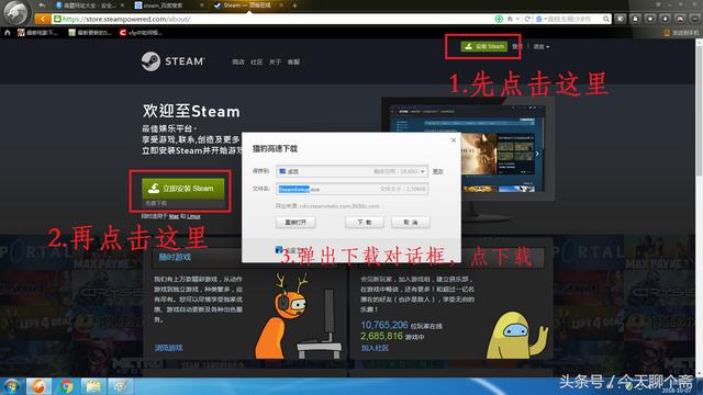 再点击右上角绿色的“安装steam",在随后打开的页面中点击“立即安装steam”,然后开始下载steam平台。