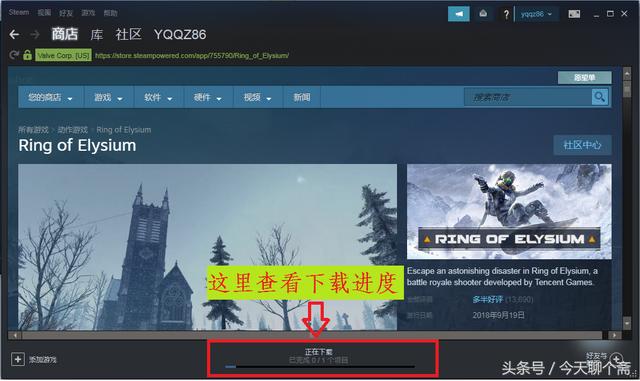 在平台的主页中,先点击“商店”,再在搜索栏中输入”ring of elysium"(不输引号),在出现的搜索结果中点击带有”免费开玩“的那个。