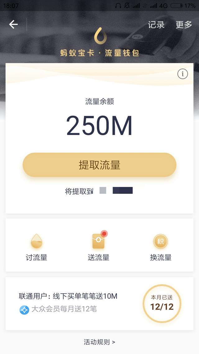 大家都知道,现在支付宝支付经常会送10m的流量,而这个流量,正好可以兑换联通的流量。