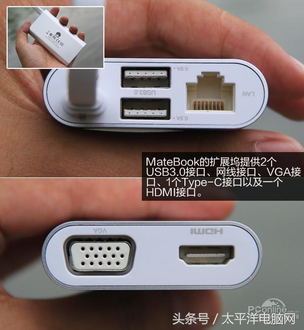 华为MateBook12英寸的机身限制了本身接口数量的设置,仅有一个USB Type-C接口一个Micro USB接口以及HDMI接口。但是华为为消费者准备了一个功能丰富的扩展坞,MateBook的拓展坞提供了2个USB 3.0接口、网线接口、VGA接口、1个Type-C接口以及一个HDMI接口。