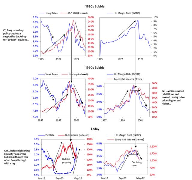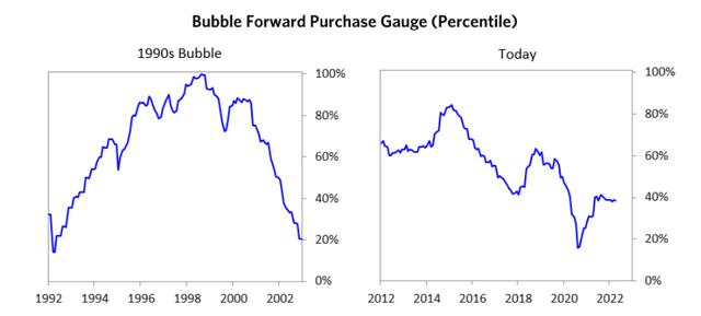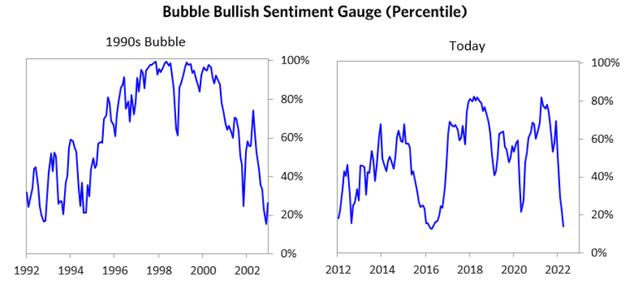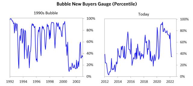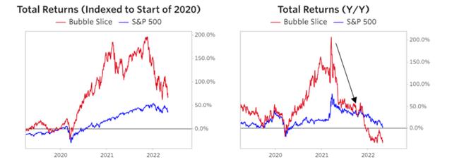 从1月到现在,这些泡沫股相继“爆裂”,在过去一年中下降了大约三分之一,而同期标准普尔500指数大约持平。虽然随着零售活动出现了有意义的减缓,市场情绪出现了有意义的恶化,新兴科技股似乎不再处于泡沫之中,但其实这些“曾经的泡沫股”似乎也没有大幅摇摆到相反的极端,所以现在不一定是购买它们的好时机。