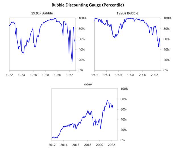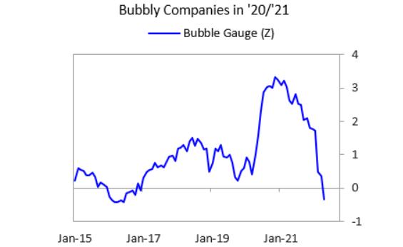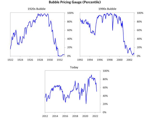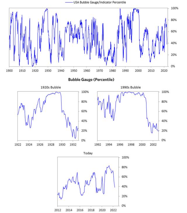 按照我们的衡量标准,美国股票总体上看起来仍然被高估了。历史表明,一旦开始爆裂,泡沫往往会过度修正到下行,而不是在稳定在更 "正常 "的价格区间。