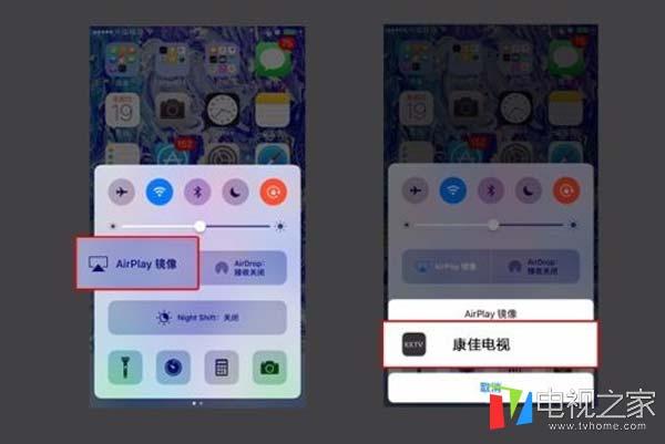 步骤2:将苹果手机调出快捷菜单界面,选择Air play在Air play中选择所要链接的康佳电视