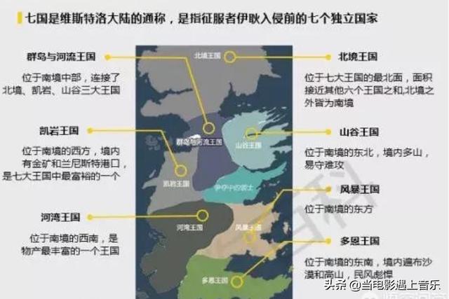 我们再来看一下《权利的游戏》中的七大王国,七大国是指当年的坦格利安王朝建立之前就存在于维斯特洛大陆上的七个国家,他们分别是北境王国、山谷王国、河屿王国、凯岩王国、风暴王国、河湾王国和多恩王国。伊耿带领他的三条龙从黑水河登陆相继灭掉了其中的六国,而多恩王国在其国王的带领下奋力抵抗,誓死抵抗,最后伊耿也不得不承认多恩的独立自治。