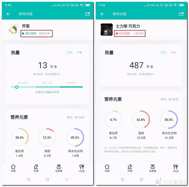 搜索对应的食材后显示它对应的热量信息、营养元素、同类排名以及是“绿灯推荐食用”还是“红灯少量食用”。
