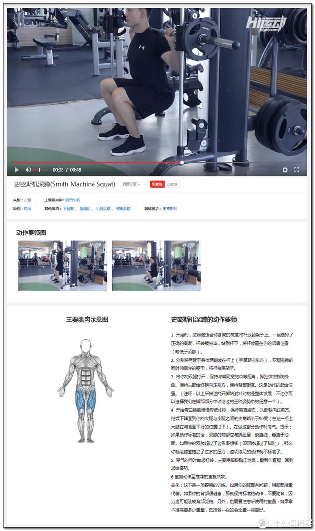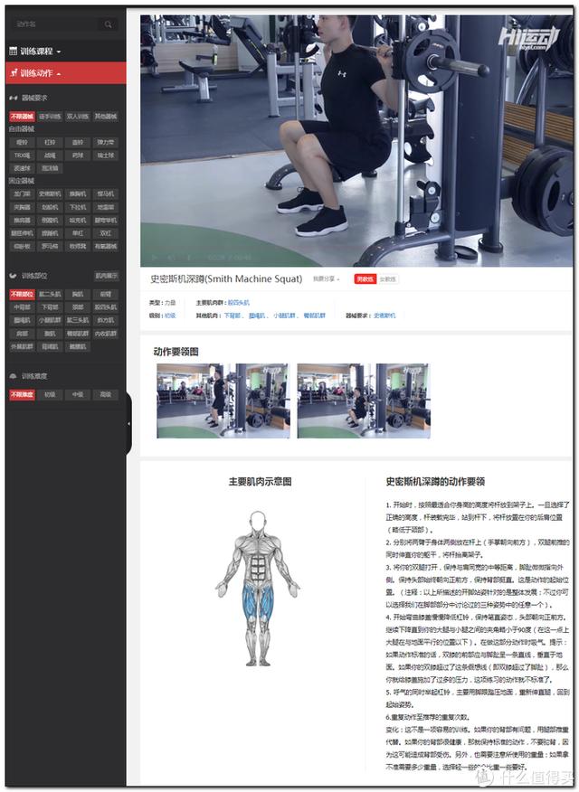 网页版随便点个器械或者目标锻炼部位,就跳转到筛选界面了。左侧是筛选项右侧是对应的教学视频,视频底部还有图文说明。
