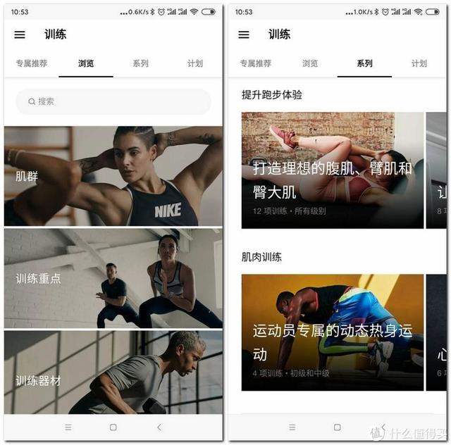 “浏览”和“系列”类似于keep的“部位”和“课程”,是单个部位或者多个部位组合的内容。