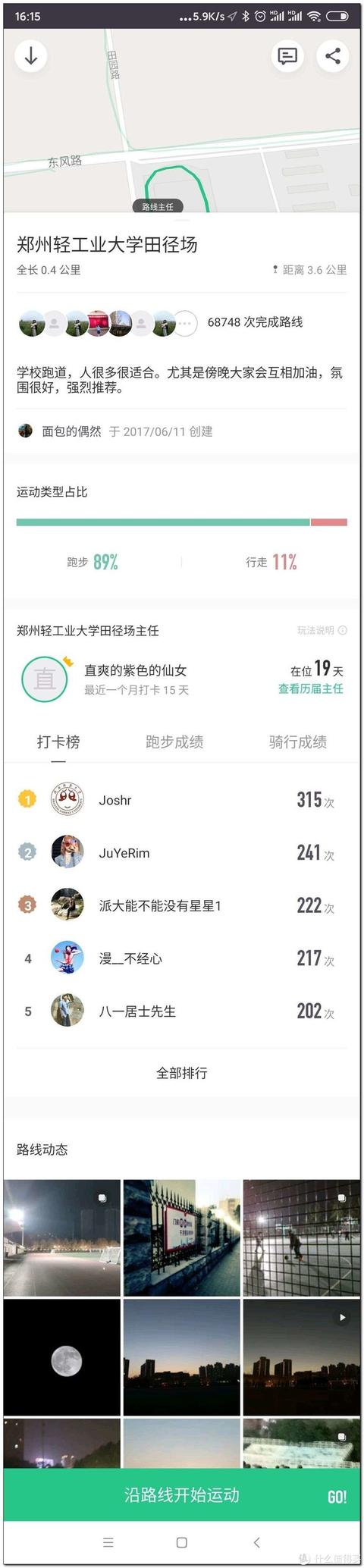 点开详细的单个线路可以看到对这个路线的评价、路线里跑步和走路的比例、以及对应的照片等等信息。