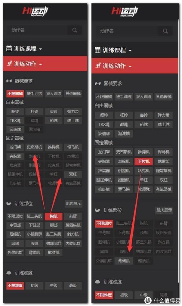 可以对器械要求、固定器械、训练部位、训练难度的分类,选中器械后显示能练的部位,选中部位后显示哪些器械能练右侧是对应的视频