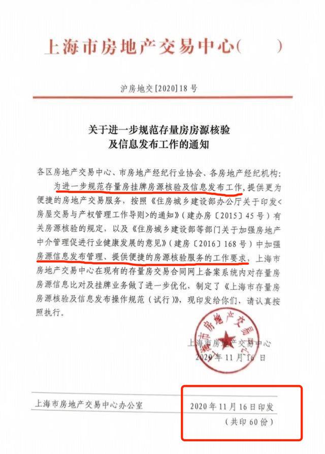 这里说的政策,是指去年11月16日,上海市房地产交易中心办公室印发的《上海市存量房房源核验及信息发布操作规范(试行)》。