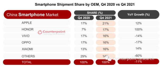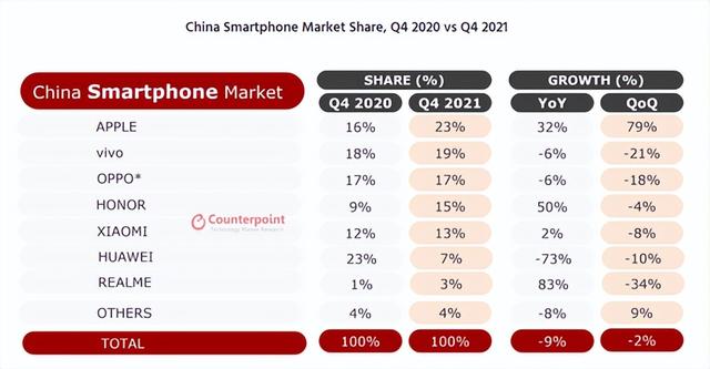 结合信通院的数据看,在iPhone13系列发布后的12月,国产手机出货量占比仅有68%,也就是说当月32%的出货量都是iPhone的。
