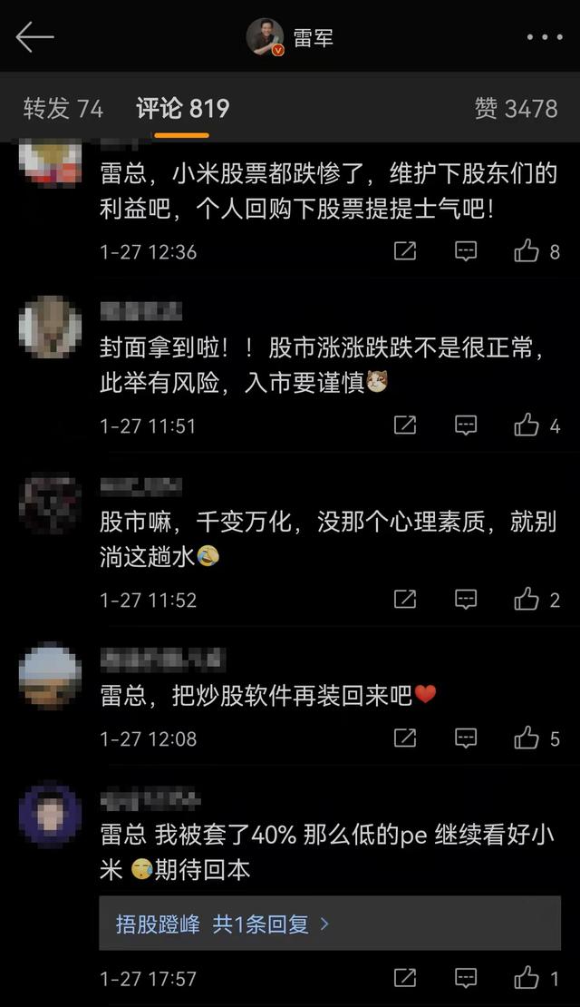 今天,雷军发布微博晒出“虎年限定微信红包封面”,却意外遭到股民在微博下“围追堵截”。“小米股票破发了,救救小米吧。”“雷总,小米股价要支棱起来啊,都亏了三四十万了。”“能不能正面回应一下股价啊,受不了啦。”