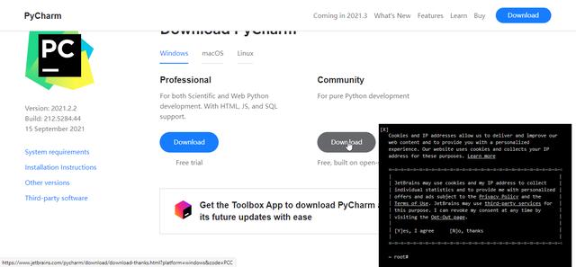 等待一会就安装好了。接下来我们安装pycharm,为什么用Pycharm呢?主要是因为我懒,记不住好多语句,Pycharm可以提示我,而且纠错也更方便,所以我就用它编写程序了。搜索Pycharm,点击下载。