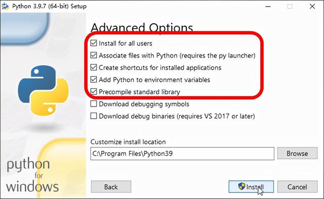 将高级选项的前五个√都勾上,点Install。