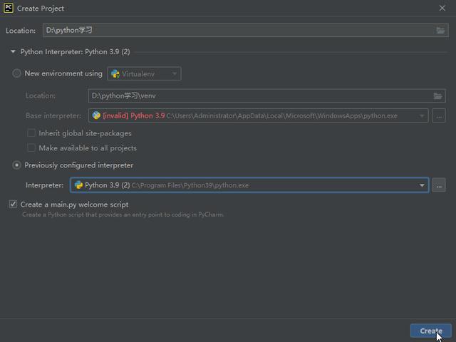 选择"Python 3.9"