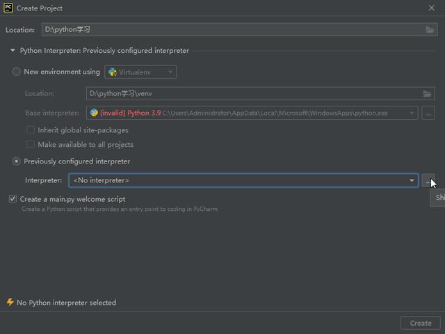 选择“Previously configured interpreter”后面的按钮,
