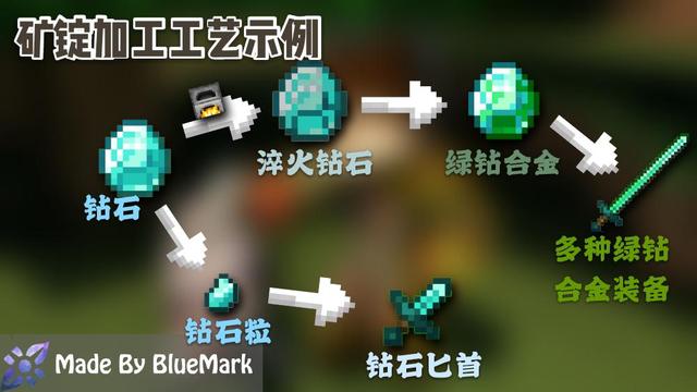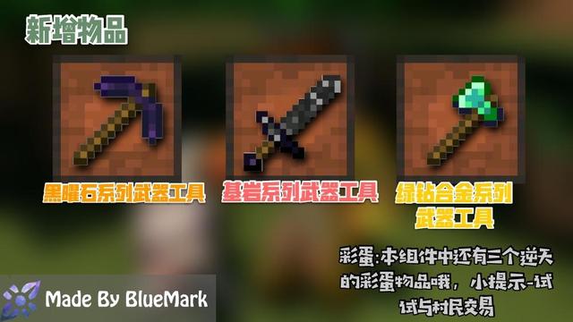 介绍:本组件在原版装备的基础上进行了拓展,每种矿锭的工具都有了新的拓展系列,并且还增加了黑曜石系列、绿钻合金系列、基岩系列的各种装备!可见下图部分工具、工具的拓展以及矿锭的加工工艺