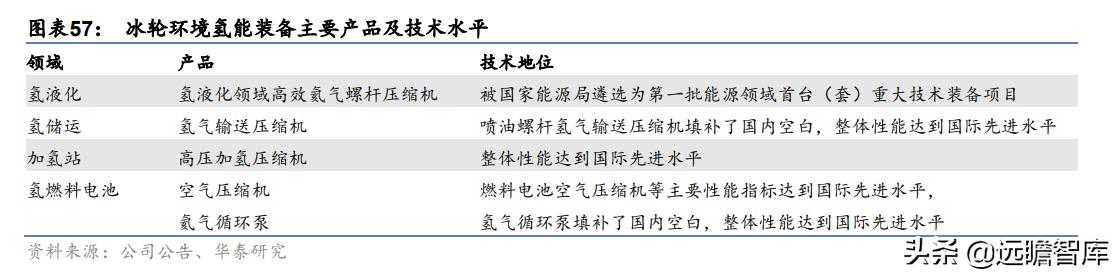 冰轮环境氢能压缩机产品体系布局完整,覆盖氢液化、氢储运、加氢站、燃料电池全产业 链,技术达到国际先进水平。