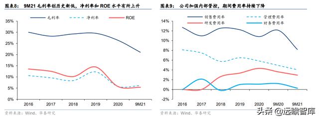 2016-2019年公司综合毛利率维持在30%左右,原材料成本压力下,2020年毛利率下降至26.4%,9M21年进一步降低至21.1%,公司通过智能化工厂提升生产效率,加强费用控制,9M21净利率和ROE水平有所上升,净利率6.1%/yoy+0.4pct,ROE5.3%/yoy+0.8pct,我们预计21~23年公司毛利率分别为:22.68%、22.67%和22.76%。