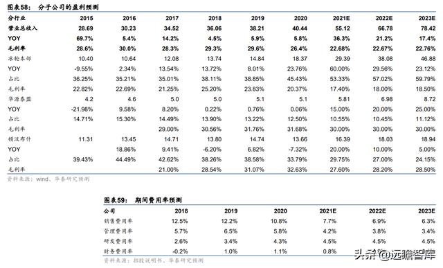 我们预计21~23年公司管理费用率分别为4.2%、3.8%和3.4%,销售费用率为7.7%、6.9%、 6.3%,研发费用率方面我们预计将维持在4.5%左右。