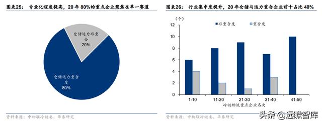 2020年仓储与运力重点企业重合的部分中,前 10 位的头部企业占比40%,冷链行业的市场集中程度在不断提高,头部企业的资源集聚效应和发展速度加快,业务复合式发展,推动细分市场走向成熟。