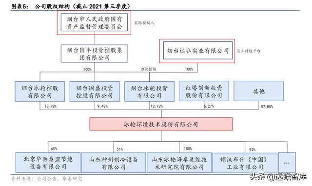2016年公司完成国企改革,实现整体上市,设立员工持股平台,绑定管理层利益,激发公 司活力。截至2021H1,公司的实际控制人为烟台市国资委,通过烟台国丰投资控股集团间接控制35.93%的股份。烟台远弘实业有限公司是员工持股平台,100%持股烟台冰轮投资有限公司,持有公司12.72%的股份。