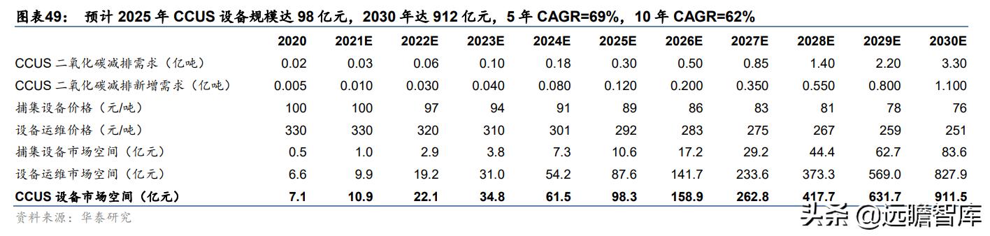 2020年我国CCUS设备需求7.1亿元,我们预计2025年CCUS设备规模达98亿元,5年CAGR=69%;2030年达 912 亿元,10 年 CAGR=62%。