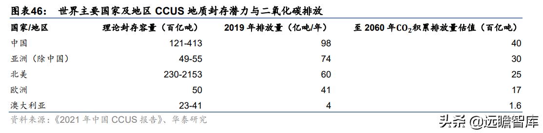 供给上,根据《2021年中国CCUS报告》的预测,全球陆上理论封存容量为6~42万亿吨,海底理论封存容量为2~13万亿吨,总理论封存容量为8-55万亿吨,其中中国的地质封存潜力约为1.21-4.13万亿吨,约占世界总封存潜力的10%。