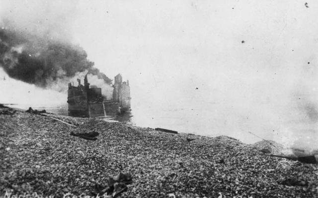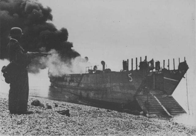 一名德国士兵目视着迪耶普海岸边熊熊燃烧的英军登陆艇。
