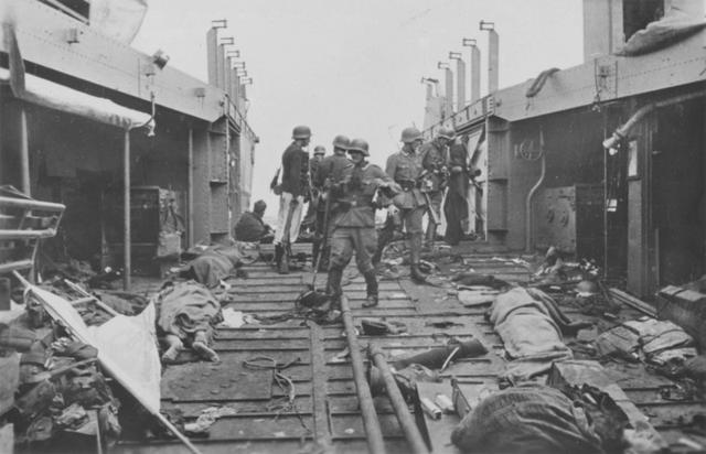 数名德国士兵登上迪耶普滩头的英军登陆艇,上面的加拿大和英国士兵的尸体清晰可见。