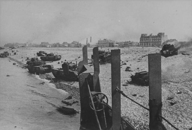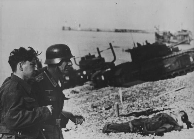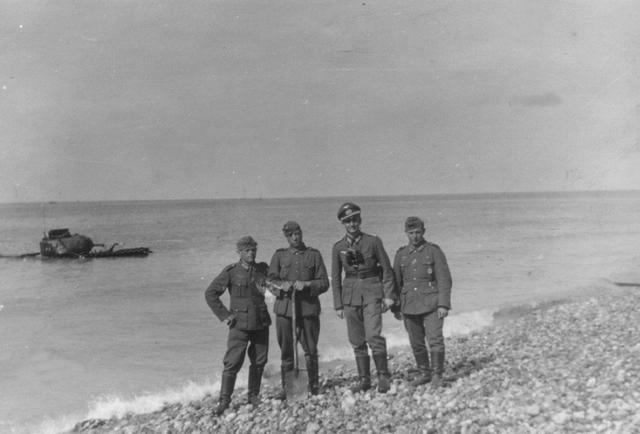 在英国皇家海军特遣队和空军的支援下,登陆行动始于1942年8月19日早晨5点,但至当日上午9时,在德军快速反应下盟军被迫下令撤退。这次行动以盟军的迅速惨败而告终。参加登陆作战的6086名官兵中,有3623人阵亡、受伤或被俘(约占总兵力的60%)。 国防军第10装甲师坦克歼击排排长埃普尔中尉与手下士兵们在法国城市迪耶普的沙滩上合影留念。