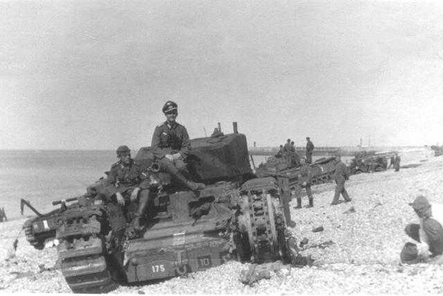 迪耶普海滩上,德国官兵坐在被摧毁的英军“丘吉尔”坦克上合影