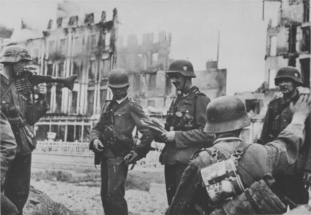 战斗结束后,在迪耶普岸边被摧毁的房屋边休息的德军官兵。