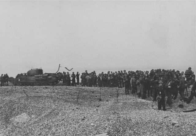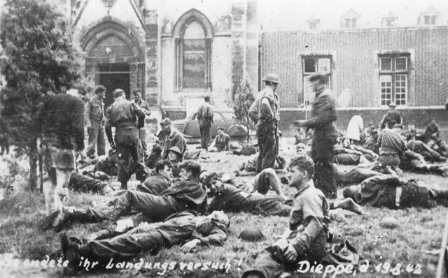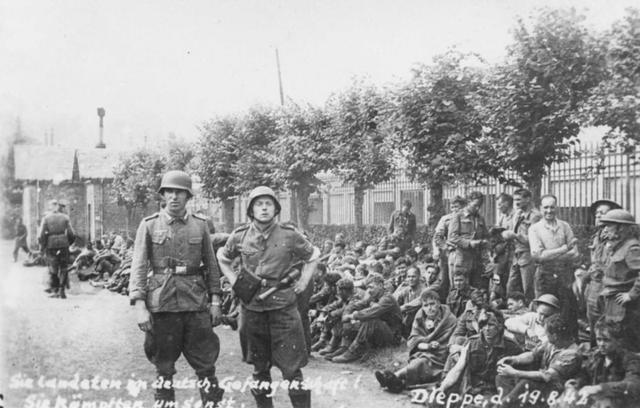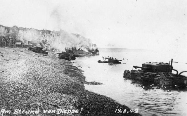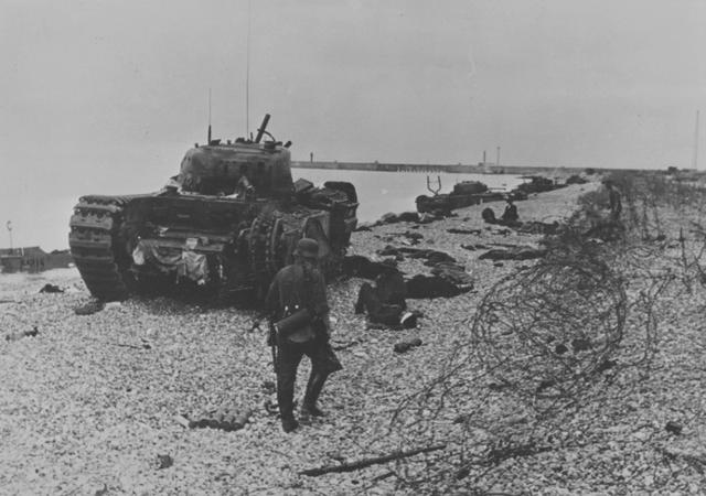 同盟国空军也在与德国空军的战斗中失败,损失了106架作战飞机,而据德国空军自损48架飞机。 一名国防军上士搀扶着一名加拿大俘虏走上滩头,不远处是被摧毁在迪耶普滩头的“丘吉尔”坦克。