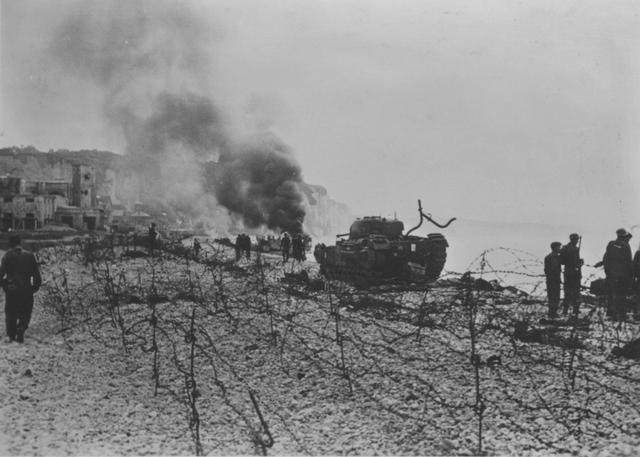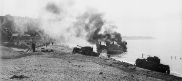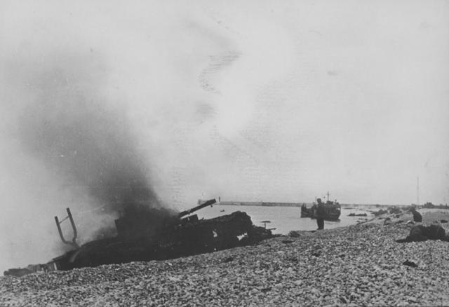 迪耶普海滩上,被击毁的加拿大军的“丘吉尔”坦克,远处是正在燃烧的英国登陆艇。
