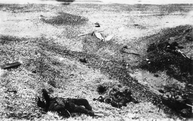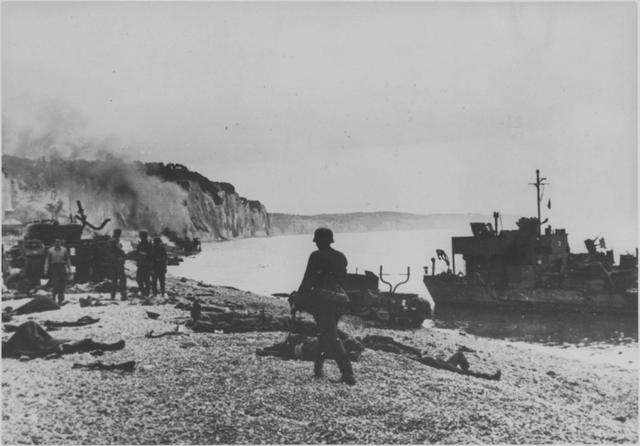 迪耶普海滩上,一名德军士兵从损毁的敌军技术装备和被击毙的加拿大士兵的尸体旁走过。