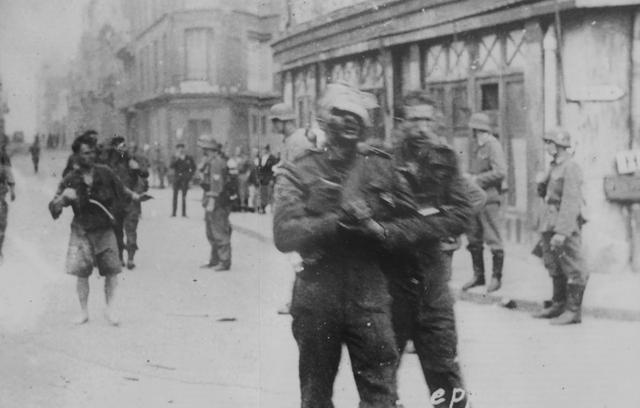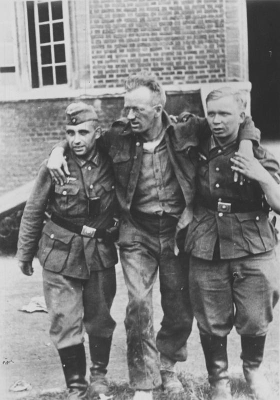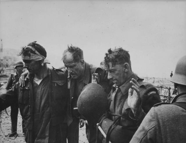 在迪耶普市的街上,两名德国士兵正搀扶着一名受伤的加拿大战俘。