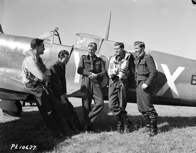 参与“庆典”行动的加拿大飞行员们倚靠在一架“喷火”战斗机旁闲聊。