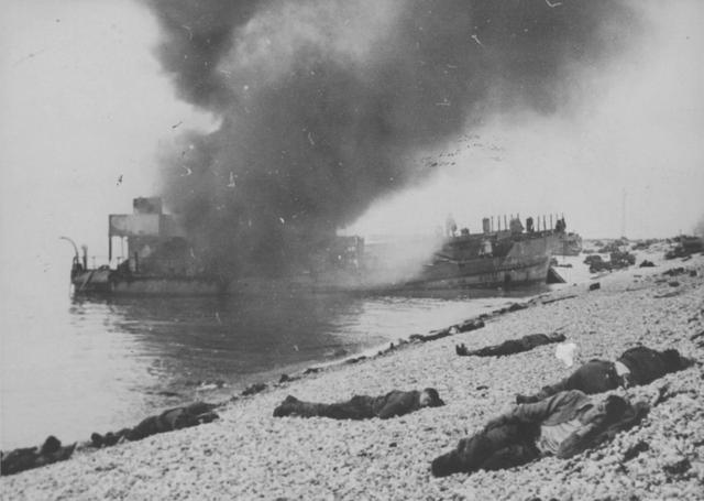 被打死在迪耶普海滩上的加拿大士兵,不远处是一艘正在燃烧的英军登陆艇。
