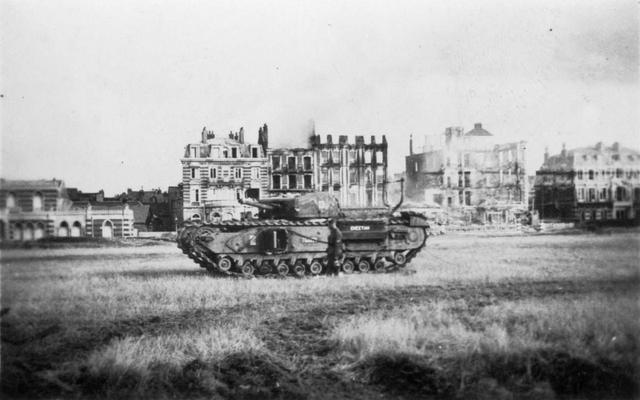 一名德国士兵正在查看一辆被击毁的“丘吉尔”坦克,远处是毁于战火中的迪耶普市的建筑。