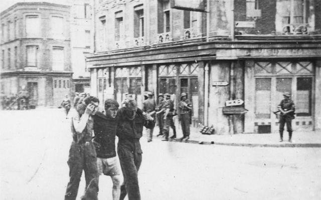 一队被俘的加拿大士兵行走在法国城市迪耶普的街道上。