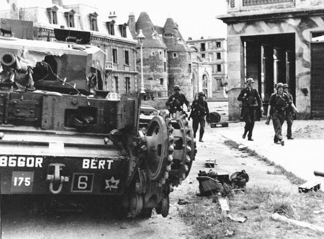 五名德国官兵走在迪耶普市的街道上,近处是一辆被击毁的“丘吉尔”坦克。