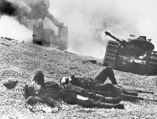 迪耶普海滩上燃烧的“丘吉尔”坦克和被打死的士兵。