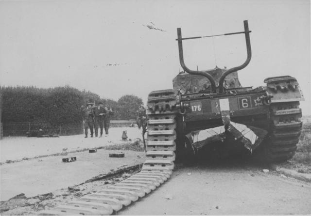 从英军登陆艇上拍摄的被遗弃和摧毁在滩头的“丘吉尔”坦克。