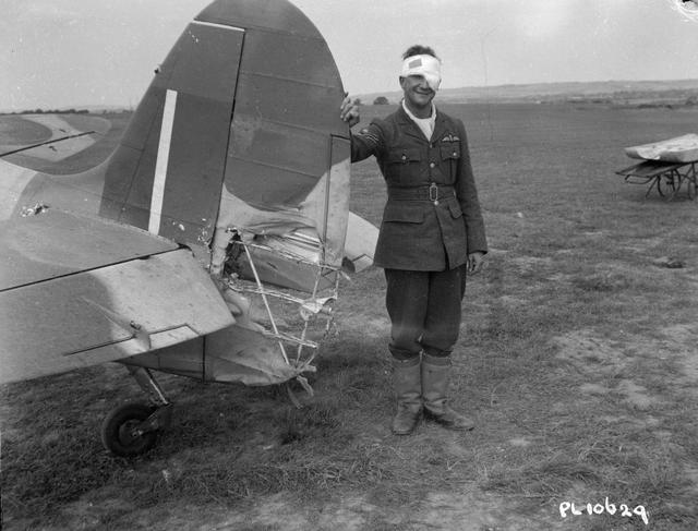一名受伤的加拿大飞行员站在自己受损的喷火式战斗机旁。