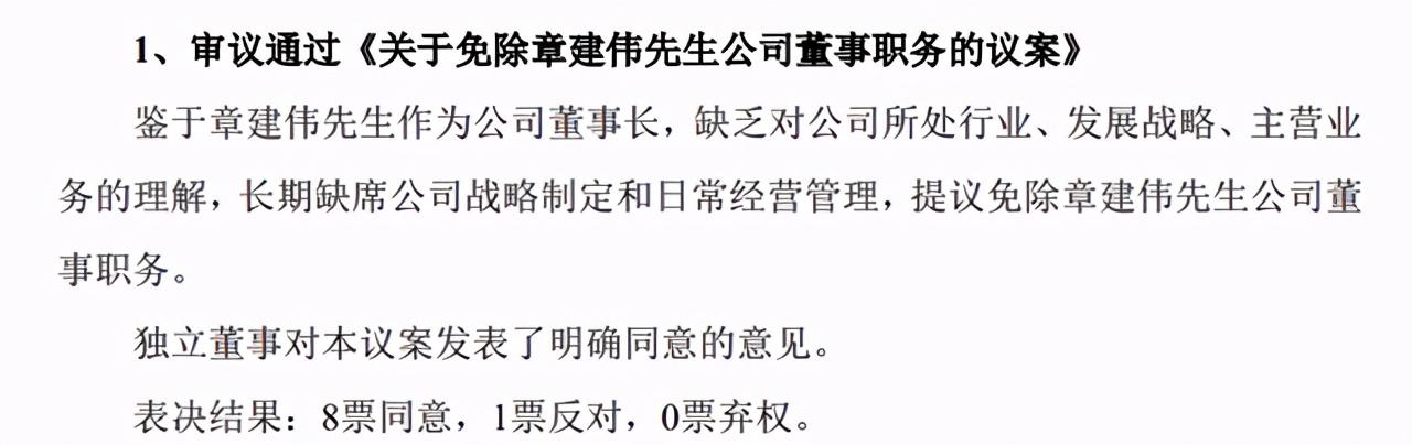 公告称,鉴于章建伟作为公司董事长,缺乏对公司所处行业、发展战略、主营业务的理解,长期缺席公司战略制定和日常经营管理,提议免除章建伟董事职务。出席会议的9名董事中,8名投了赞成票,仅章建伟投了反对票,理由为罢免毫无根据,系个别董事为私利之举。