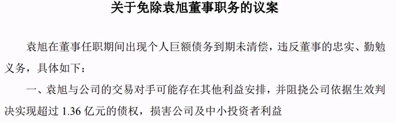 章建伟很快进行了反击。3月29日,公司董事会收到章建伟提交的《关于免除袁旭董事职务的临时提案》,提请将其作为临时提案提交公司2021年第一次临时股东大会审议。章建伟指出,袁旭在董事任职期间出现个人巨额债务到期未清偿,违反董事的忠实、勤勉义务,并依次列出了四条罪状。