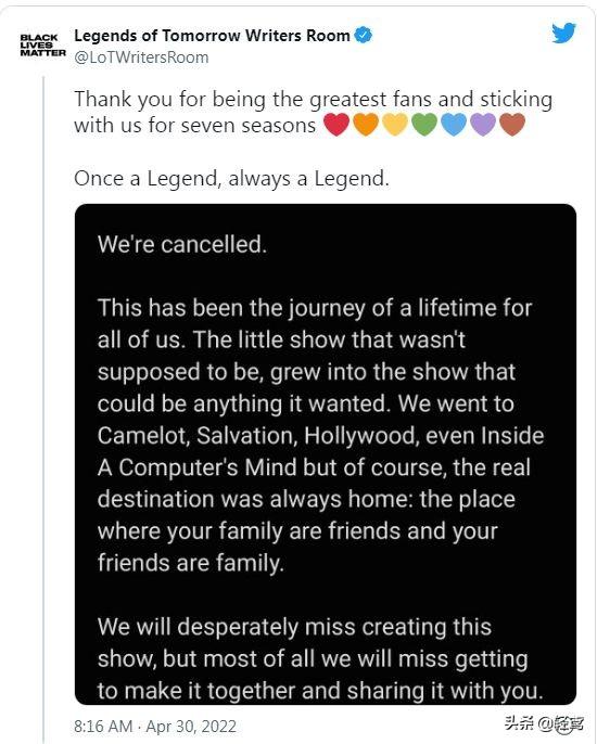 噩耗和乌云笼罩了DC绿箭宇宙系列剧集,上周五官方发布消息《蝙蝠女侠》被砍止步第三季!几个小时后,另一部剧集《明日传奇》也面临砍剧命运,确定看不到第八季,两部剧的剧组团队都在推特上感谢影迷长久以来的支持,气氛相当感伤,粉丝们4月发起声势浩大的 #RenewLegendsOfTomorrow(续订明日传奇) 声援活动,最终以失败收场没有影响电视台高层的决定。